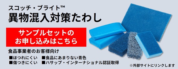お手頃な価格で異物混入対策ができる製品をテストしていただくための、スコッチブライト™ 異物混入対策たわしサンプルセットをご用意しています。